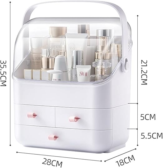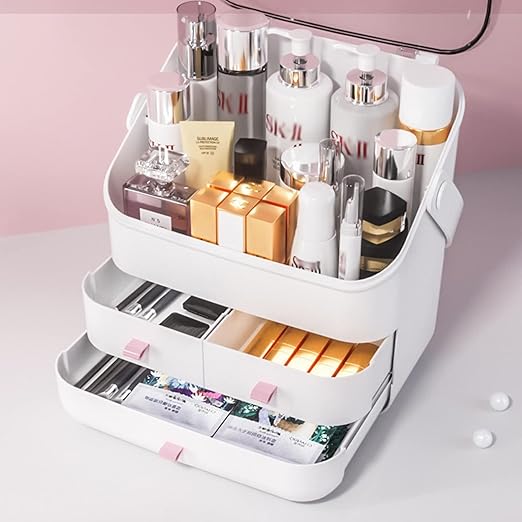 Classified Storage - Four independent spaces allows for convenient classified storage. The upper layer is 8.3in high to hold skincare bottles etc. Bottom 3 drawers can store lipsticks, eyeliner, nail clippers and more.